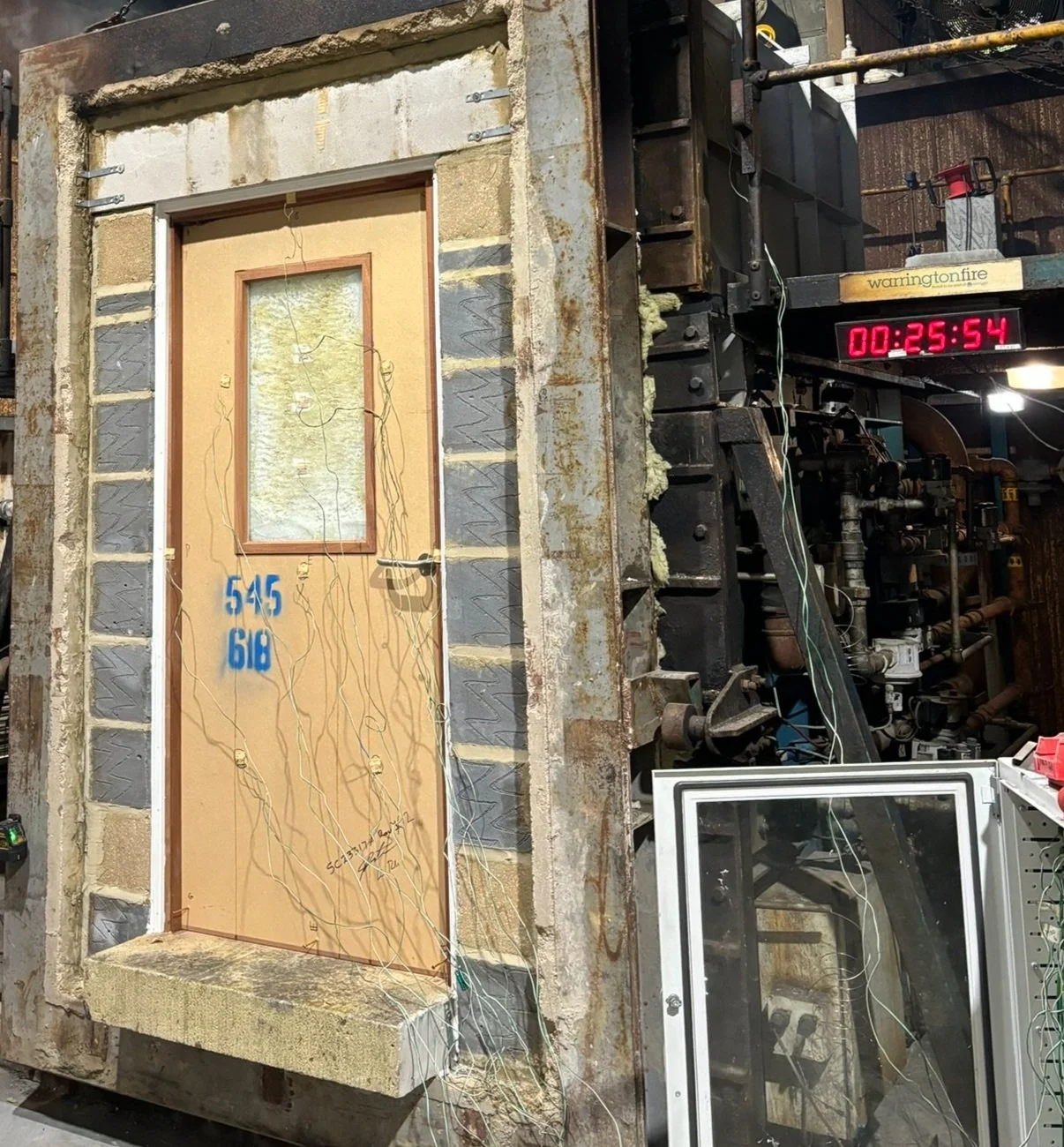 The completed door set including all the fitted ironmongery, was then delivered to the BM TRADA, Warrington Fire testing facility in High Wycombe where it was installed on the testing rig ready for the burn test. The installation of the door set was fitted all in accordance with the installation instructions we had supplied with it, and everything was checked prior to the commencement of the test.